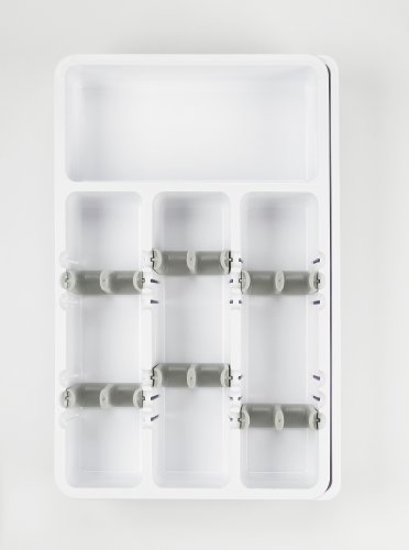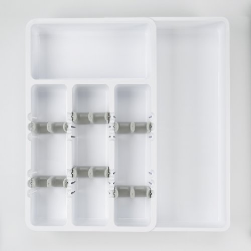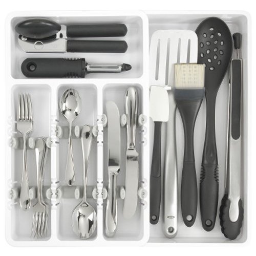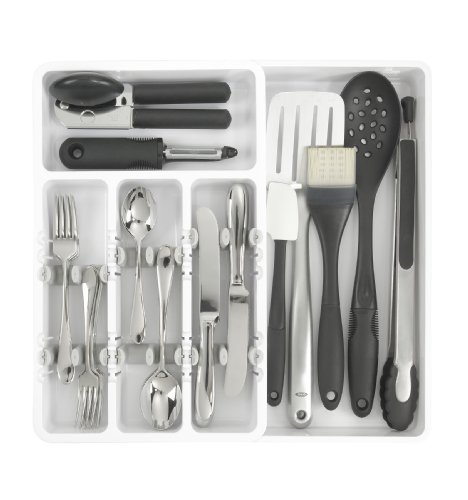 Keep your utensils neatly stacked with the OXO Good Grips Expandable Utensil Organizer. The Adjustable Dividers organize more utensils in less space by allowing them to fit in opposite directions in one compartment. Your utensils stay neatly stacked, even when the drawer is opening or closing. Adjust the location of the Dividers to accommodate utensils of different shapes and sizes, or remove the Dividers completely for open compartments. The expanded space holds longer tools and gadgets for added storage. To adjust Dividers, simply pinch the side walls and slide in or out. The Organizer expands from 9.75-inch to 16.25-inch to fit inside kitchen drawers, and non-slip feet keep the Organizer in place.