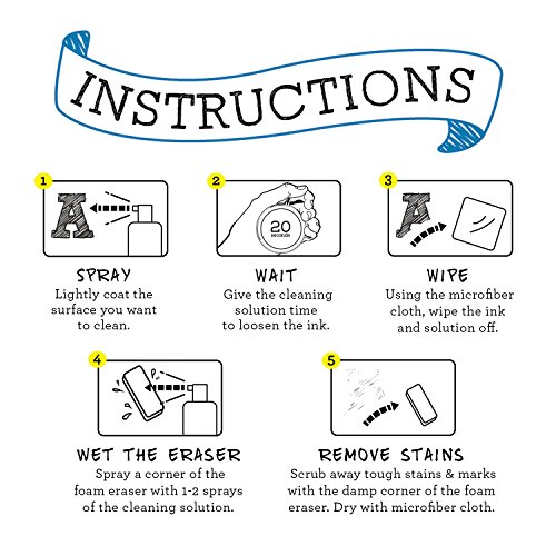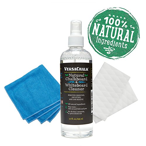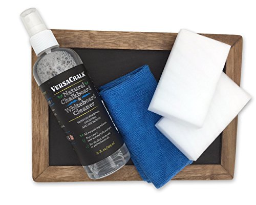 TRIPLE ACTION CLEANER - Spray, erase and wipe! Kit includes 10 oz all natural chalkboard spray, 2 magic erasers, and a durable 25"x25" microfiber cloth.