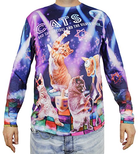 -. Brand : Faux Real -. Department : womens -. Feature : What better way to celebrate Hanukkah then with this Cats and the Dreidel and the Silver Spoon Long Sleeve T-Shirt? / Imported. 100% Polyester / Machine Wash / Photorealistic design so real it will make you look twice / Gives you an instant outfit complete with attitude adjustment -. ProductGroup : Apparel -. ProductTypeName : ADULT_COSTUME -. Title : Faux Real Cats and The Dreidel and The Silver Spoon Unisex Long Sleeve T-Shirt for Men and Women - Adult Size
