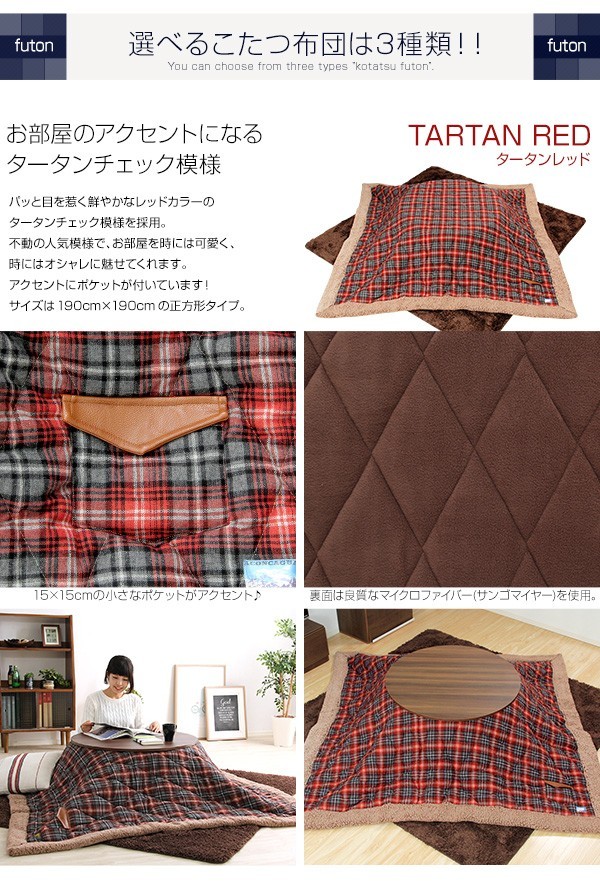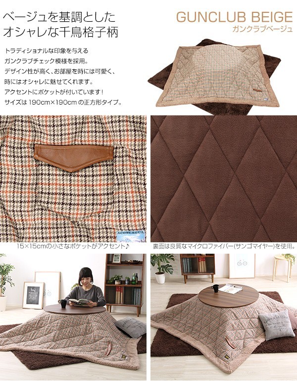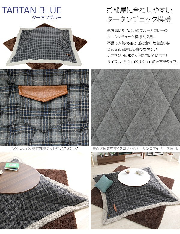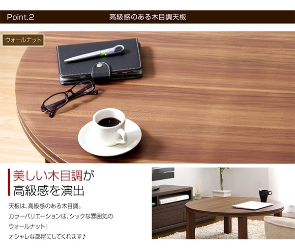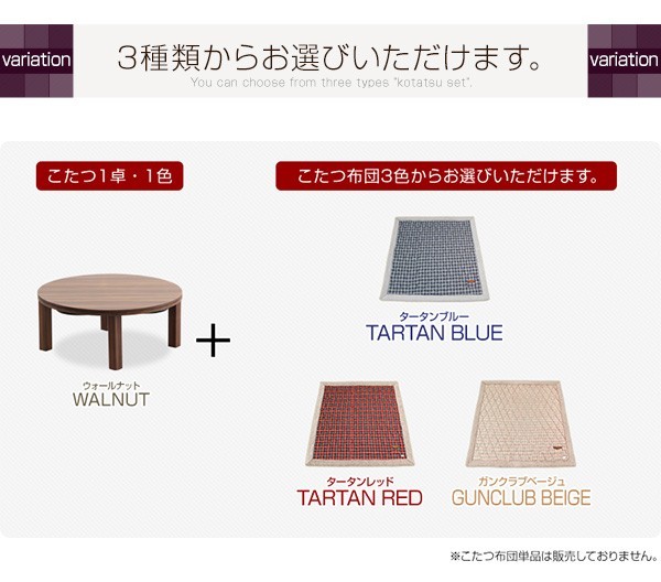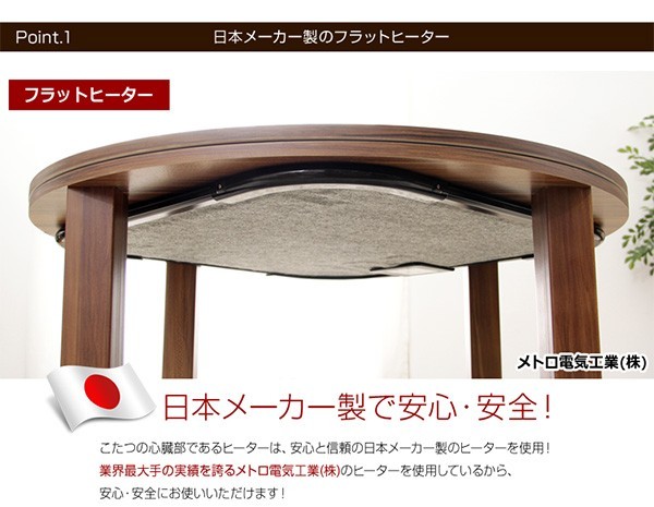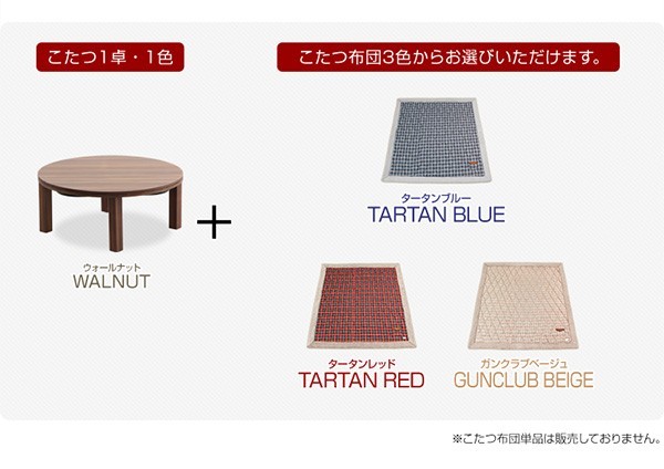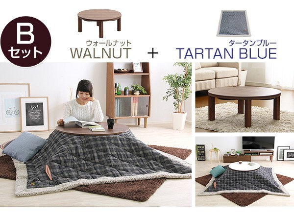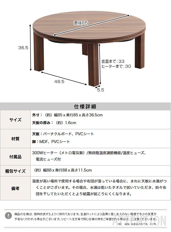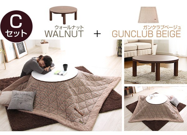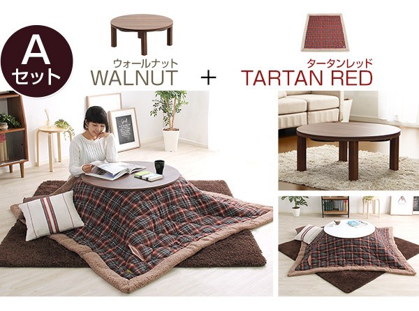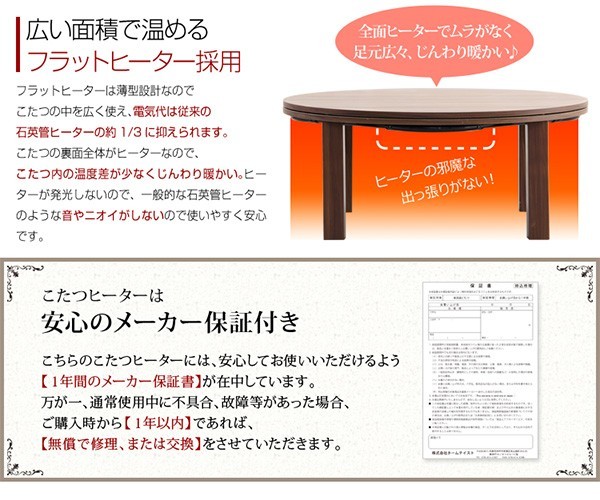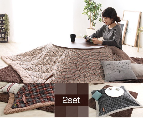 【商品について】ポケット付こたつ布団セット!フラットヒーターこたつ2点セット(丸型・85cm幅)■サイズ:本体外寸:(約)幅85x奥行85x高さ36.5cm (約)17kg布団:(約)幅190x奥行190cm (約)3kg■カラー:Aセット、Bセット、Cセット■素材:(こたつ本体)天板:パーチクルボード、PVCシート 脚:MDF、PVCシート※付属品:300Wヒーター(メトロ電気工業製)/無段階温度調節機能/温度ヒューズ、電流ヒューズ付(こたつ布団) キルティング製品表側:ポリエステル50%、アクリル30%、その他20%裏側:ポリエステル100%■その他:・完成品でお届けします。※脚はお客様取付け本体:(約)88.5x88x11.5cm (約)18kg布団:(約)55x45x25cm (約)4kg