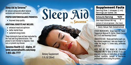-. Binding : Health and Beauty -. Brand : Sleep Aid by Savanna® -. Color : Blue Bottle -. EAN : 0028672060054 -. Feature : Sleep Aid temporarily assists in increasing deep sleep time with fewer wake-ups for Best Sleep Ever! / Relieves stress, moodiness, disquiet, low feelings associated with poor sleep - gentle temporary aid / All-natural extract helps balance/maintain natural serotonin levels-daily use offers daily relief / Not-habit-forming, leaves you rested, not drowsy, after use! No side effects, allergens, or toxins / 1 Fl Oz (30ml) bottle w/dropper -serving: one full dropper (1 ml), 1 time daily -30 doses per bottle -. IsAdultProduct : 0 -. Label : Savanna Health, LLC -. LegalDisclaimer : Statements about or describing Sleep Aid by Savanna® have not been evaluated by the Food and Drug Administration. The product is not intended to diagnose, treat, cure, or prevent any disease. -. Manufacturer : Savanna Health, LLC -. Model : SSA -. MPN : 10-1101 -. PackageQuantity : 1 -. PartNumber : 10-1101 -. ProductGroup : Health and Beauty -. ProductTypeName : HEALTH_PERSONAL_CARE -. Publisher : Savanna Health, LLC -. Size : 1 Fl Oz -. Studio : Savanna Health, LLC -. Title : Natural Patented Formula Assists Body Processes: Balances Serotonin & Melatonin ➜ Temporary Relief of Mild Anxiety, Stress, Insomnia - Daily Use Enhances Mood & Feelings of Well-being - No Dependency -. UPC : 028672060054