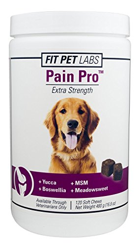 -. Binding : Misc. -. Brand : Fit Pet Labs -. EAN : 0857976007027 -. Feature : Supports pets suffering from inflammation in tendons and muscles or pain associated with soft tissue damage, degenerative joint diseases or the aging process / 120 Soft Chews / Made In The USA -. Label : Fit Pet Labs -. Manufacturer : Fit Pet Labs -. PackageQuantity : 1 -. ProductGroup : Pet Products -. ProductTypeName : PET_SUPPLIES -. Publisher : Fit Pet Labs -. Studio : Fit Pet Labs -. Title : Fit Pet Labs Pain Pro Extra Strength - 120 Soft Chews -. UPC : 857976007027