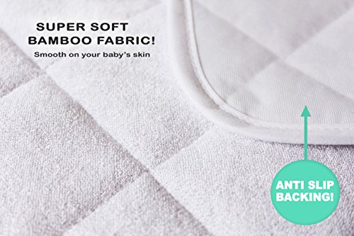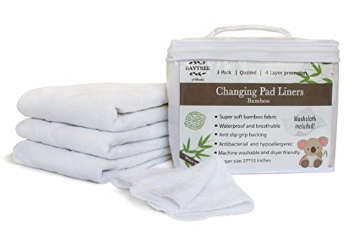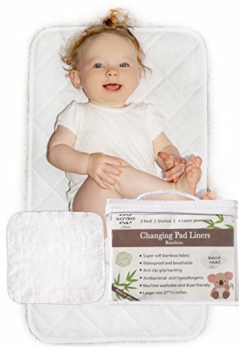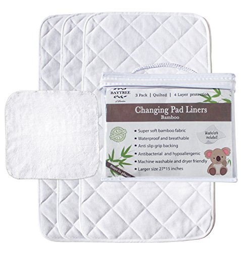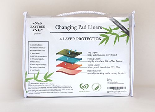 The 4 layer waterproof system The Baytree diaper pad liners have a 4 layer system that is waterproof and efficiently catches both big and small diaper change accidents. ? The top layer is a silky soft bamboo blend made of 70% bamboo fiber mixed with 30% microfiber terry fabric. While super smooth on your baby's delicate skin it is also sturdy enough for multiple machine washings. ? Layer number two is an absorbent microfiber cotton filling that effectively absorbs any fluids and adds cushioning. ? Layer three is a waterproof nonwoven fabric laminated with a 100% non-toxic, vinyl free and latex free TPU film to stop any liquid coming through. ? The bottom layer provides the anti slip backing to keep the changing pads in place, which also protects the TPU layer from washing machine wear and tear. Made from a knitted polyester fabric.