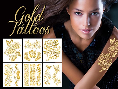 -. Feature : This package includes a gorgeous collection of 6 Gold tattoo sheets / Premium quality, Made in the USA / 100% waterproof and very long lasting...for up to 5 days, even while swimming & bathing / Easy to apply in just 10 seconds with water, easy to remove with rubbing alcohol / Great for gifts & parties