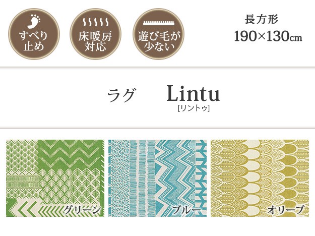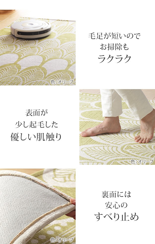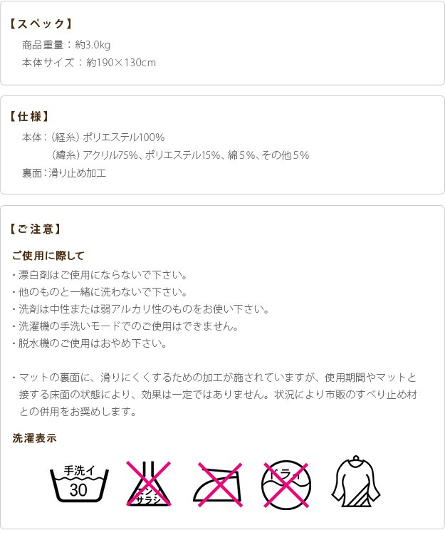 ※メーカー直送のため代金引換はお受けできません。※こちらの商品は、沖縄・離島へのお届けはお受けしておりません。【カラーバリエーション】グリーン・ブルー・オリーブ【仕様】本体(経糸):ポリエステル100%本体(緯糸):アクリル75%、ポリエステル15%、綿5%、その他5%裏面:滑り止め加工【サイズ】約190x130cm重量:約3kg