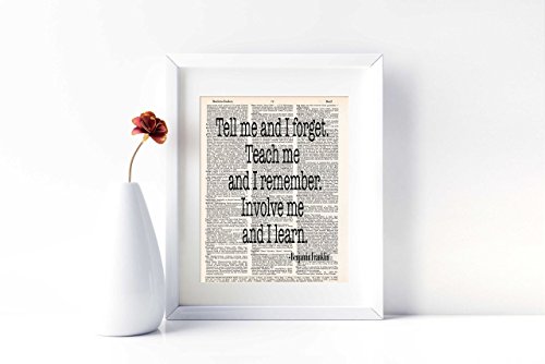 "Tell me and I forget. Teach me and I remember. Involve me and I learn." This great quote from Benjamin Franklin is printed on a page from a vintage dictionary page. Makes a great gift for teachers or lifelong learners.