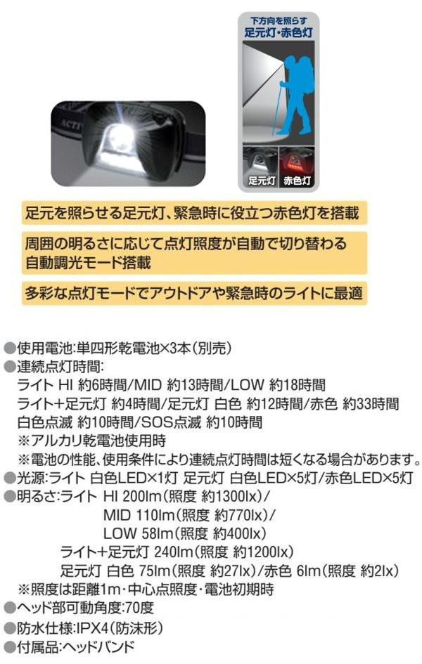 足元を照らせる足元灯、緊急時に役立つ赤色灯を搭載したヘッドライトです。