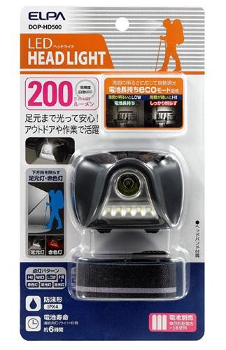 足元を照らせる足元灯、緊急時に役立つ赤色灯を搭載したヘッドライトです。 製造国:中国 商品サイズ:幅65×高さ48×奥行41mm(最大値) 重量:約48g(ヘッドバンド、電池除く) 仕様:単四形アルカリ乾電池×3本(別売) 付属品:ヘッドバンド ※サプライヤー直送品 ご注文後3~4営業日後の出荷となります【商品名】ELPA(エルパ) LEDヘッドライト DOP-HD500