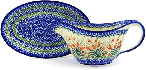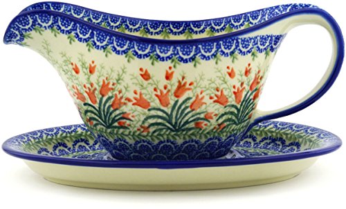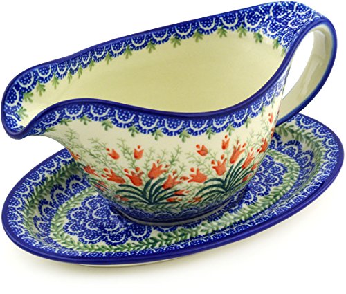 Studio : Ceramika Artystyczna Publisher : Ceramika Artystyczna Product Description Polish Pottery 16 oz Gravy Boat with Saucer made by Ceramika Artystyczna, Sprouting Tulips Theme Dimensions: 5¾" wide, 9" long, 4½" high Capacity: 16oz Polmedia Polish Pottery Stoneware is: * Hand crafted and hand painted in Boleslawiec, Poland * Microwave safe, dishwasher safe, oven safe up to 480 F, freezer safe * Lead and cadmium free * Crack and chip resistant * Intended for everyday use, easy to clean * Highly collectable About Polish Pottery Polish pottery is known for its versatility in the kitchen and on the table. It is safe for use with food in the microwave, freezer, oven and dishwasher. Polish stoneware is resilient to abrasives making it durable and resistant to scratching or chipping. It distributes heat evenly for perfect baking and is also nonstick for easy clean-up, making it easy to care for. The bright patterns never fade, and are offered in thousands of variations to mix and match. It is this combination of function and beauty that makes Polish pottery so appealing. The pottery is fired in electric and gas kilns at temperatures exceeding 2200 degrees Fahrenheit. This results in a stoneware that is meant to resist aging and provide lasting beauty that stands the test of time. Polish stoneware is lead and cadmium free. Polish Pottery is hand crafted and hand painted in the Boleslawiec region of Poland. This region is famous for its naturally found white clay which artisans have used for centuries to craft this durable and beautiful stoneware. Each piece of pottery is carefully formed and painted by hand to ensure that exceptional attention to detail is paid to each piece. The most beautiful and intricate patterns are called UNIKAT patterns. These patterns bear the artist's signature. 0