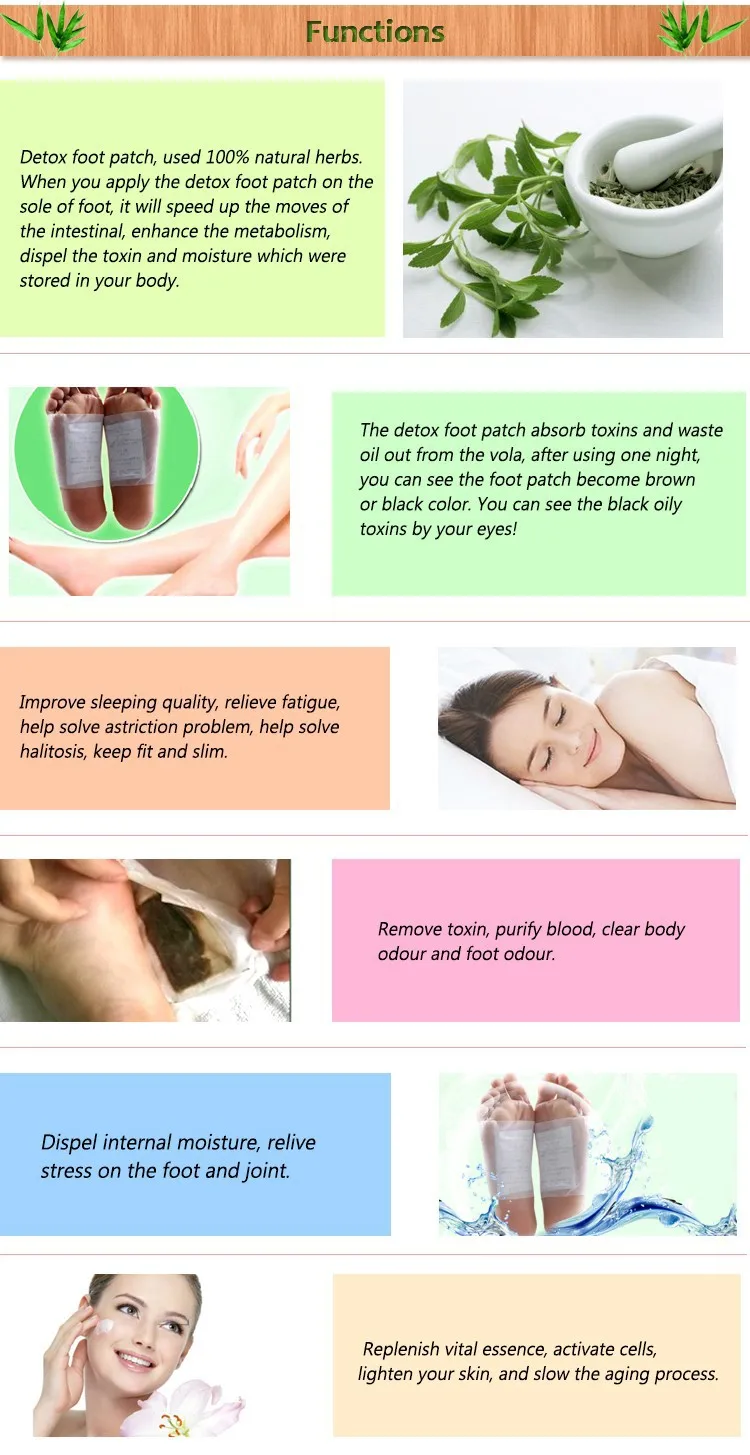 FUNCTIONS: 1. Detox foot patch, used 100% natural herbs. When you apply the detox foot patch on the sole of foot,