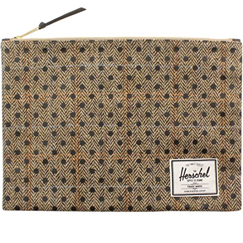 Large enough to fit letter sized documents, this oversized pouch blends the highly regarded harris tweed fabric with screenprinted stripped or polka dot pattern for a new rendition of a classic.Feature