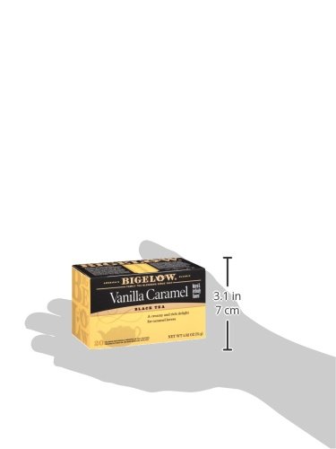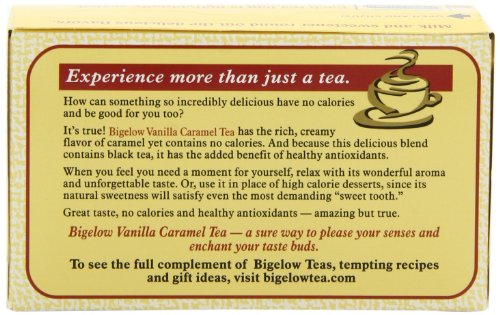 -. Binding : Grocery -. Brand : Bigelow Tea -. EAN : 0072310001695 -. Feature : Pack of six 20-count boxes of calorie-free tea (120 total tea bags) / A rich and robust black tea flavored with vanilla and caramel / Gluten free, with no calories and no carbohydrates; Kosher Dairy / An excellent source of healthy antioxidants / Ships in Certified Frustration-Free Packaging -. IsAdultProduct : 0 -. Label : Bigelow -. LegalDisclaimer : Actual product packaging and materials may contain more and different information than what is shown on our website. We recommend that you do not rely solely on the information presented and that you always read labels, warnings, and directions before using or consuming a product. -. Manufacturer : Bigelow -. Model : 7231000169 -. MPN : 529097-00169 -. NumberOfItems : 6 -. PackageQuantity : 6 -. PartNumber : 529097-00169 -. ProductGroup : Grocery -. ProductTypeName : GROCERY -. PublicationDate : 2010-10-13 -. Publisher : Bigelow -. ReleaseDate : 2006-06-22 -. Size : 6 Pack -. Studio : Bigelow -. Title : Bigelow Vanilla Caramel Tea, 20-Count Boxes (Pack of 6) -. UPC : 072310001695