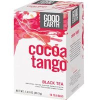 -. Binding : Misc. -. Brand : Good Earth -. EAN : 0027018102939 -. Feature : 18 bags per box - Pack of 4 boxes / Blends together the sweet and sensual flavors of cocoa with the heat of chili peppers and black tea / No artificial flavors, colors or preservatives -. Label : Good Earth -. Manufacturer : Good Earth -. MPN : 127723-5 -. PackageQuantity : 4 -. PartNumber : 127723-5 -. ProductGroup : Grocery -. ProductTypeName : GROCERY -. Publisher : Good Earth -. Studio : Good Earth -. Title : GOOD EARTH TEA BLK HRBL COCOA TANGO, 18 BG -. UPC : 027018102939