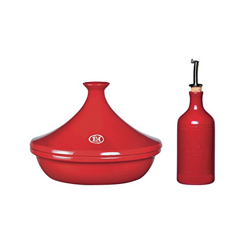-. Brand : Emile Henry -. Color : Red -. EAN : 3289313297322 -. Feature : Made from Flame Ceramic. Can be used directly on the heat or in the oven. Make delicious tagines, stews and any recipe which requires simmering. / It can be used on all direct heat sources: gas, electric or halogen (with an induction disk for induction hobs) and in the oven. / Our Flame ceramic has been designed specifically for slow simmering, which brings out the flavors in the recipe / The lid has a unique shape, which allows the steam to circulate and helps keep the ingredients tender and moist. -. Label : Emile Henry -. Manufacturer : Emile Henry -. MPN : 349732 -. NumberOfItems : 1 -. PackageQuantity : 1 -. PartNumber : 349732 -. ProductGroup : Kitchen -. ProductTypeName : KITCHEN -. Publisher : Emile Henry -. Studio : Emile Henry -. Title : 2 Piece Tagine and Oil Cruet Color: Terracotta