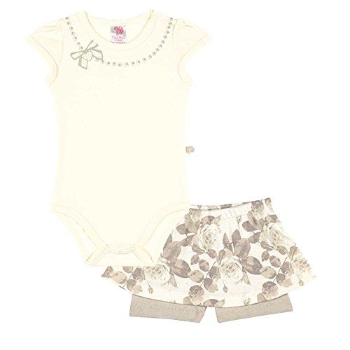 Feature : The onesie style bodysuit has snap close buttons on the left shoulder / Comes in the color khaki / The bodysuit features a necklace design with rhinestone bow and is paired with a floral print skort / Composed of 100% high quality Cotton / Machine washable - Made in Brazil
