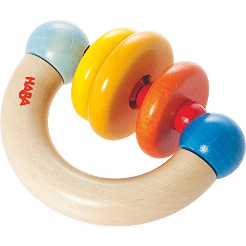 This hand-crafted Roundabout colorful clutching, teething, wooden toy is easy to grasp for the young children's hands and perfect for babies aged 6 months and up. It features beechwood in a half moon shape with three movable clatter discs in yellow, orange and red for added play.