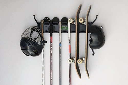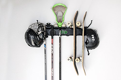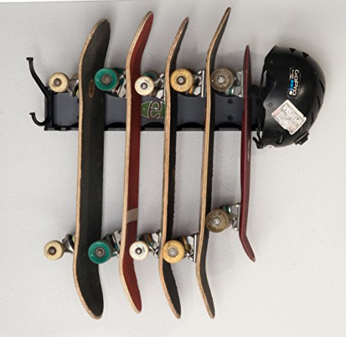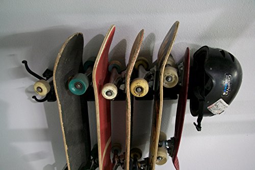 Studio : Evolution Performance Sports, LLC Publisher : Evolution Performance Sports, LLC Product Description Wall Mount skateboard rack sports equipment organizer. Ideal for holding up to 5 skateboards, 2 or more helmets and much more. Our universal design is perfect for multiple sports equipment including hockey, lacrosse, baseball, field hockey, floorball, light equipment, backpacks, hats much, much more. Made in the USA. 0