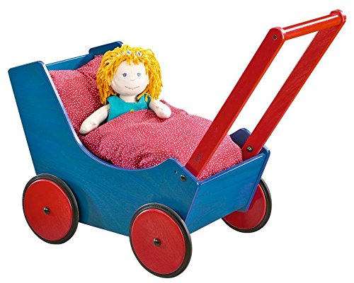 HABA's Doll Pram (Blue) is the perfect pushing toy for the child who is inseparable from their dolls. The version is blue with red polka dotted bedding.