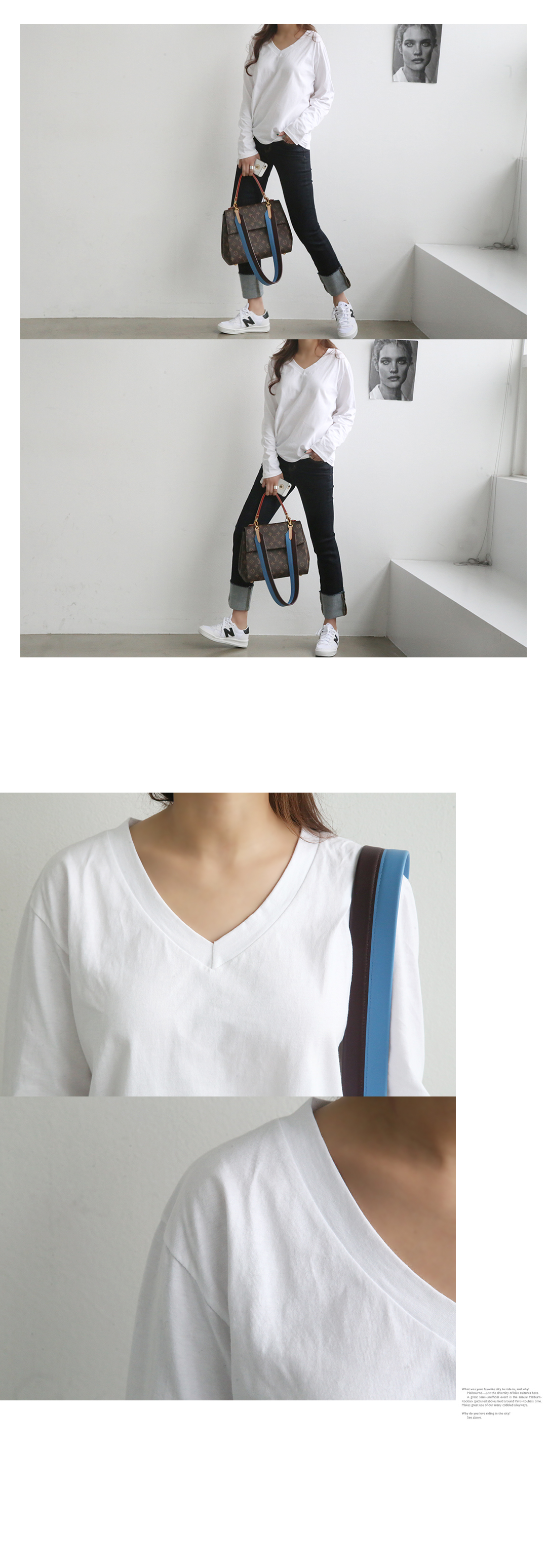 매시즌 즐겨입기 좋은 면티를 소개할게요.가장 기본적인 베이직 컬러 3가지로 준비했고요, 면100%로 보송한 촉감이 매력적이랍니다.브이넥 라인으로 목과 어깨라인을 여리여리하게 보여줘요.다양한 아우터와 함께 레이어드 하기 좋아 자주 손이 가는 아이템이랍니다.가벼운 소재감으로 부담없으며, 편안하게 착용가능하구요 어떤 코디에나 두루두루 잘 어울려 하나쯤 소장하면 좋은 아이예요.데일리 아이템이로 추천하는 요아이 지금 바로 초잇해보세요.