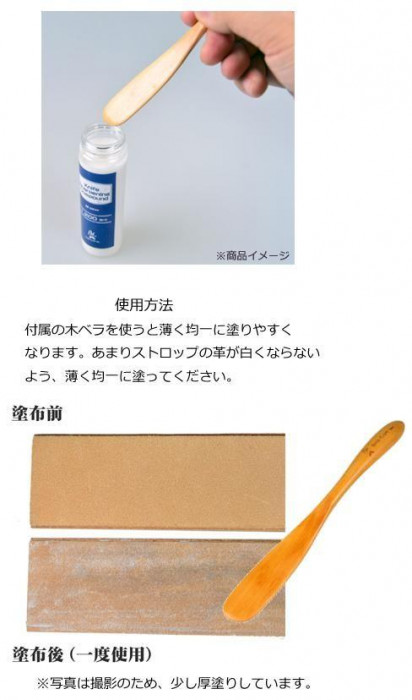薄く均一に塗布しやすく塗り味がほとんど変わりません。そのため刃物がストロップの上をとてもスムーズに動き、均一にムラなく研ぎあげることが可能になります。徐々に研磨成分が積層した際も、剥離させやすくストロップを長くご愛用いただけます。 |