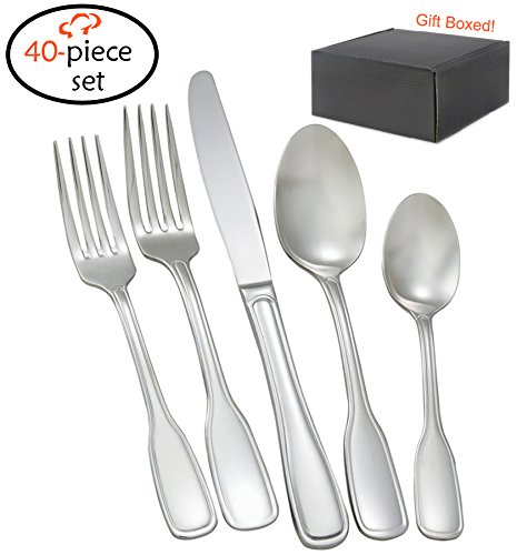 - - 40-Piece Set: Includes 8 of each: Salad fork, dinner fork, dinner knife, dinner spoon and teaspoon