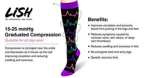 LISH 15-25mmHg Compression Socks offer a great starting point for first-time wearers of compression support socks. They provide exceptional support, are available in stylish colors and patterns and will re-energize tired and achy legs while delivering the right amount of pressure to your ankles and calves. These compression socks for nurses offer a compression grade of 15-25mmHg and are specially designed to aid performance by improving circulation and blood flow, supplying your muscles with more oxygen and decreasing muscle soreness during and post exercise. Longer length, mid-calf nurse socks are made to improve discomfort, swelling, and will help to move blood to areas of the legs that need it most while you remain active. Features Benefits: Compression grade of 15-25mmHg delivers right amount of pressure to your ankles and calves to re-energizes tired and achy legsImproves circulation and blood flow, supplying muscles with more oxygen and decreasing muscle sorenessHelps reduces discomfort and swelling in legs and feetCrafted from ultra-stretchy fabrics for easy on and offPerfect for: Nurses, Athletes, Pregnant Women, or Avid Travelers Fabric Content: 80% Polyamide, 19% Elastic, 1% Spandex Care Instructions: Machine wash cold, tumble dry. Do not iron, bleach, or dry clean 0