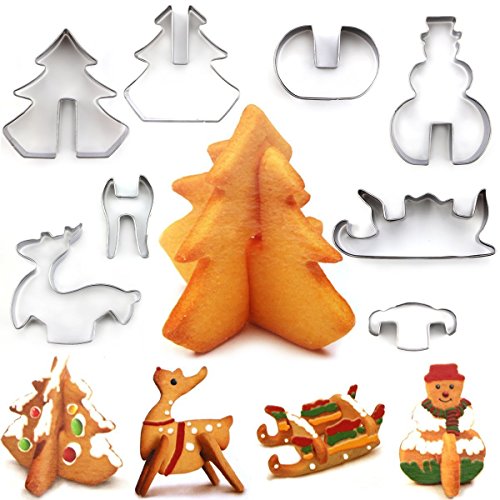 MerryMore Christmas Cookie Cutters Set Stainless Steel Biscuit Cutter Tool 3D Baking Mold 8 Packs - Christmas Tree, Snowman, Sleigh, Elk for Kids Party