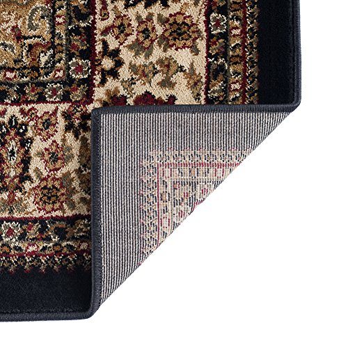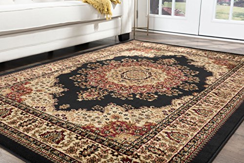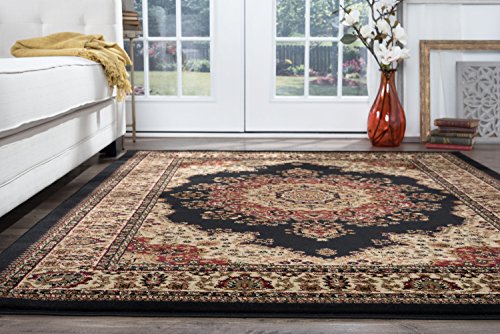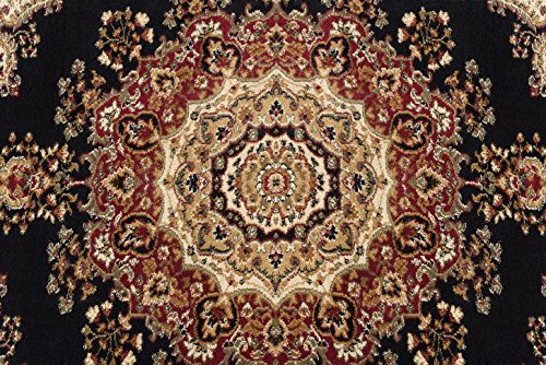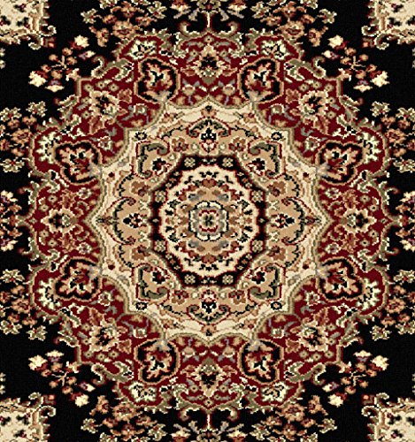 Features an exquisitely defined medallion design, created in beige and red on deep black. The detailed border has floral accents reflecting the colors in the medallion design. This classic rug will be the perfect finishing touch for your living space. It is constructed of 100% polypropylene, allowing you to enjoy this quality design without concern. This engaging pattern is available in multiple sizes so you can carry your theme throughout your home. It is easy to care for; vacuum regularly to maintain its plush appearance for years to come. Spot clean as needed with mild detergent, do not dry clean or bleach.Feature