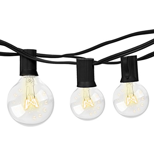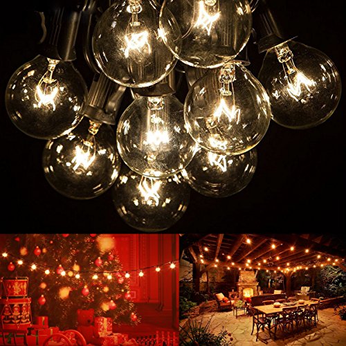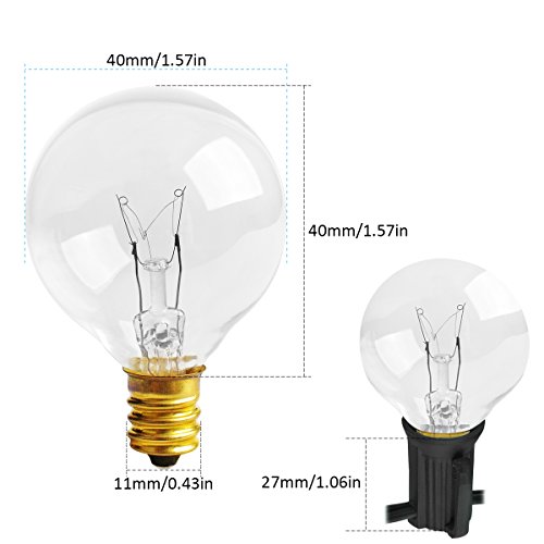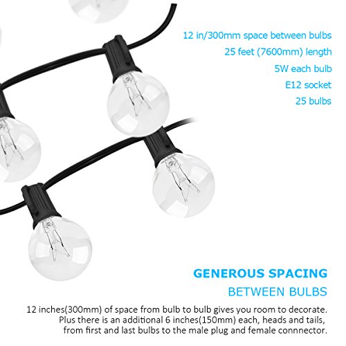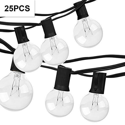 - High quality & UL listed: 25 feet long string with 25 clear G40 bulbs,includ 2 extra replacement bulbs.Light bulbs have candelabra (E12) socket base.Weather resistant design makes these the ideal outdoor/indoor string lights for any season.UL listed for general indoor/outdoor applications