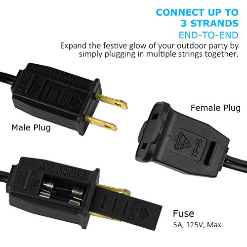 - Connectable G40 globe string lights: Features end-to-end connections,you can connect backyard patio lights one by one up to 3 strands to cover large areas.Even with broken or removed bulbs, remaining bulbs will continue to light up.Total Length: 25feet,bulb spacing: 12 inches,length of lead with male plug: 6 inches,length of tail with female connector: 6 inches