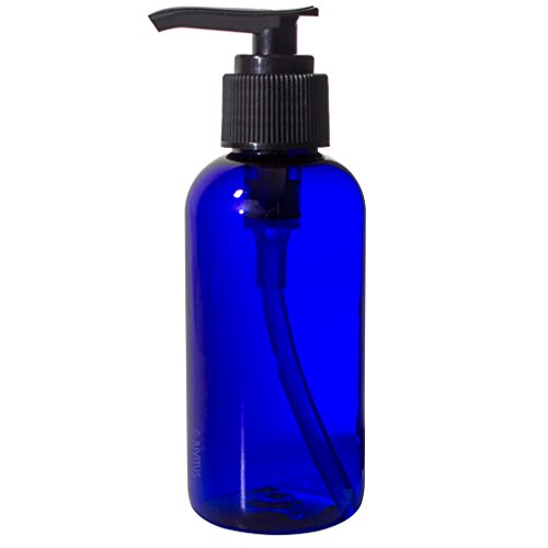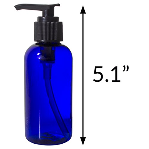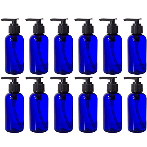 Cobalt Blue 4 oz Boston Round PET Bottles (BPA Free) with Black Lotion Pump (12 Pack) + Labels