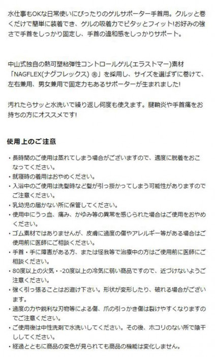 fk094igrjs濡れてもOKなので日常の水仕事にピッタリな手首用のゲルサポーターです手首にくるっと巻いて簡単装着 サイズ 全長:26cm 個装サイズ:18×10×3cm 重量 個装重量:50g 素材・材質 エラストマー 仕様 左右兼用 【適応サイズ(手首周り)】 12~24cm 製造国 日本 水仕事も安心気になる手首に ※予告なく製品の仕様が変更になることがあります予めご了承ください ※1枚売りです(左右に着用される場合には2枚ご購入ください) ※汚れがひどい場合は中性洗剤を使用し洗ってください 濡れてもOKなので日常の水仕事にピッタリな手首用のゲルサポーターです手首にくるっと巻いて簡単装着