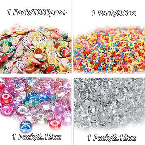 - Quantity: 2 pack fishbowl beads, 2 pack foam balls, 1 pack fruit slices, 1 pack fake candy sprinkles, 2 pieces mixing spoons