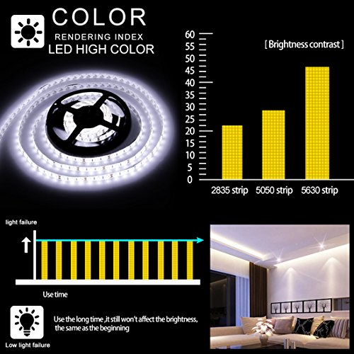 - Three modes!!!!Led light strip have 3 modes steady-on, flashing, and gradient change(BUT YOU NEED A Remote Control FOR ASIN: B014EZ4M0K) need to order separately, Dimmable High brightness Top LED, 300 LEDs, White 6000K, 15LM/LED, 3 times brightness than SMD3528 LED