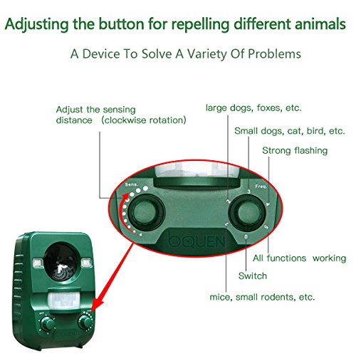 - COMPACT & EASY TO USE: Just place the portable repeller into ground via the provided spikes or hang on wall through the back hole, better to face the direction that animals come from, 5 settings to repel specific type of animal or various animals at the same time, it may take 1-3 weeks to see apparent result. 12-month Worry-Free Warranty at bQUEN.