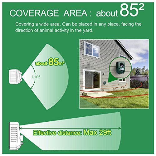 - MOTION ACTIVATED: Adjustable infrared motion sensor detects intruders motions in front direction up to 29ft to emit powerful ultrasonics and strobe lights to scare animals away, which save power. The repeller detects 110 degrees horizontally and 55 degrees vertically, total unobstructed 900sq ft area.