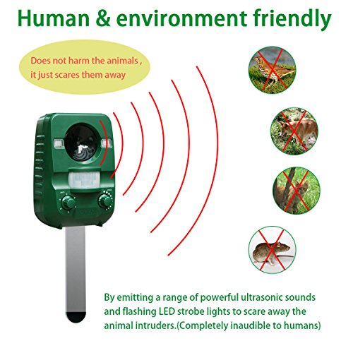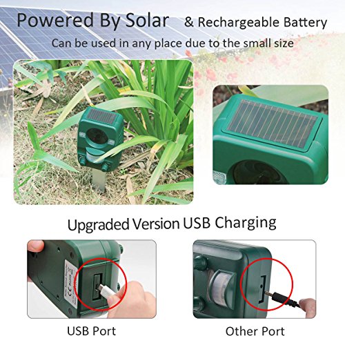 No more poop or pee and noises in your yard! Newest solar battery powered rechargeable animal & pest repeller comes with an infra-red motion sensor, which detects movement and triggers powerful ultrasonic sounds or flashing lights(especially for nocturnal animals) when intruders enter the controlled area. No chemicals or traps, harmless to humans or animals, no mess, it is totally environmentally friendly.