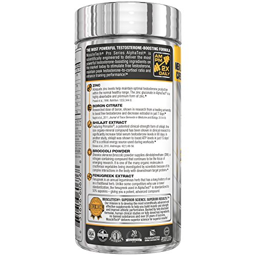 -. Feature : MuscleTech Pro Series AlphaTest is scientifically engineered to deliver a powerful testosterone-boosting ingredient matrix to stimulate free testosterone, maintain peak testosterone-to-estradiol ratio and enhance ATP levels! / AlphaTest is formulated with boron citrate that supplies a precise dose of boron shown in a recent 2011 scientific research study on eight healthy male volunteers to significantly increase free testosterone levels and decrease estradiol levels after only seven days. / Packed with cutting-edge ingredients - Broccoli powder, Fenugreek Extract, Zinc / This potent formula works with the body to naturally increase testosterone levels while staying within the normal healthy range!