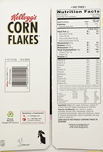 -. Feature : Kellogg's Corn flakes Cereal 43.0 / Delicious Corn flakes cereal / The original and still the best / Golden flakes of lightly sweetened corn / Enriched with 10 essential vitamins and minerals / One 43-ounce package / Classic breakfast cereal; crispy corn taste, slightly sweetened / A good source of 7 essential vitamins and minerals; fat free / No fat; no cholesterol / Delicious, oven-toasted corn flakes for an easy, fat-free, nutritious breakfast
