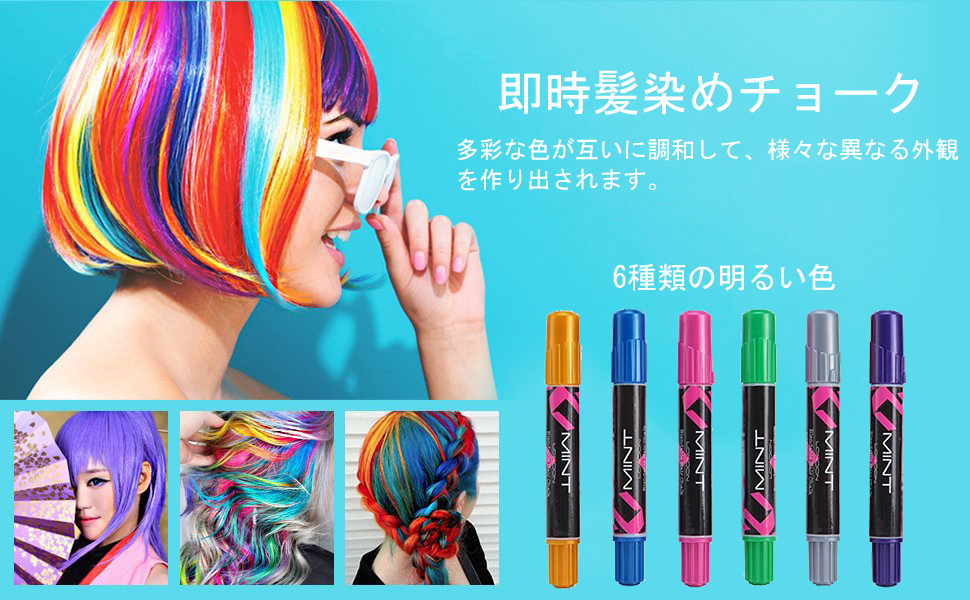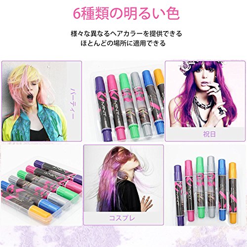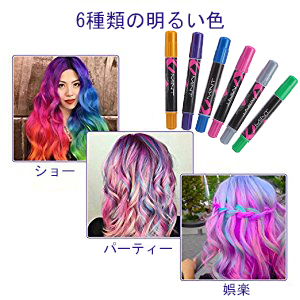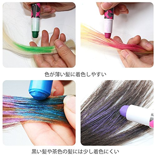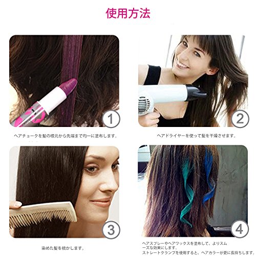 ◆多彩な色が互いに調和して、様々な異なる外観を作り出されます。ヘアスプレーの使用も要らないです。家で簡単にヘアチョークサロンをすることができます。気持ちによって、お好みのヘアカラーを変わりましょう。誰でも手軽にご使用いただき、日差しでちょっとピカピカ光ることもおもしろいポイントです。ソフトで色つけやすいから、使い方法は簡単な髪染め剤です。色が洗い流されない場合は、もう一度洗ってみてください。