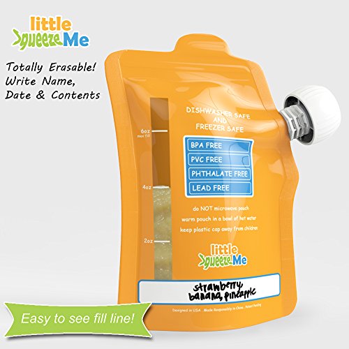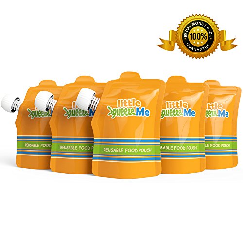 -. Binding : Baby Product -. Brand : Little SqueezeMe -. Color : Orange -. EAN : 0881314419807 -. Feature : YOU HAVE JUST FOUND THE BEST! Five refillable squeeze pouches that can hold up to 6 ounces. Self Standing Pouch when filled that features a pull tab at the top and a clear fill line with measurement markings on the back / DURABLE & HIGHEST QUALITY AVAILABLE: Little SqueezeMe pouches are BPA, PVC, Phthalate and Lead free. Extra strength double zippered pouches that are leak free. They are also dishwasher and freezer safe! Excellent for freezing meals and snacks in advance! When ready to enjoy, defrost in a bowl of warm water or use the frozen pouch as an ice pack in the cooler and will be ready by lunch / DIY HOMEMADE SNACKS: Fresh organic pureed fruits, smoothies, applesauce and yogurt. Also great for adults portioned meals, after work out protein shakes and work lunch / EASY TO CLEAN & FILL: Easy to see clear bottom to clean and no filling station needed! Just pour or spoon in through the wide top zipper opening / GO GREEN & SAVE MONEY! Tired of throwing away so many food pouches? These reusable pouches are earth friendly and made to reuse again and again. For every purchase, 2 foundations will each receive $1 to support Moms and Babies. Get yours today! 53% OFF SALE for a limited time... Buy more than 1 set and save even more! (get coupon code under Special Offers) Also check out our Little Sprouts pacifier clip -. Label : JEsentials -. Manufacturer : JEsentials -. MPN : 3190883 -. PartNumber : 3190883 -. ProductGroup : Baby Product -. ProductTypeName : BABY_PRODUCT -. Publisher : JEsentials -. Size : large, 6 oz. -. Studio : JEsentials -. Title : Little SqueezeMe - 53% OFF CYBER SALE - Large Reusable Food Pouch (5 Pack) - Easy to Fill & Clean - Double Zipper Leak Free & Self Standing - Great for Babies, Toddlers & Kids -. UPC : 881314419807