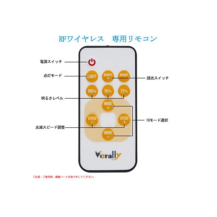 ● 리모콘 부착:전용의 리모콘이 부착,라이트의 ON/OFF,점등 모드의 변환,밝기의 조정,점멸 스피드의 선택 등의 조작을 간단 할 수 있고, 그리고,전회 조절한 모드를 기억한 기능이 부착,쓰기에 편리 함이 좋습니다.
