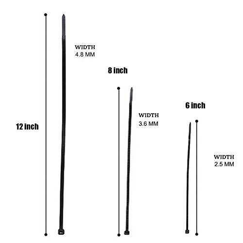 - DIMENSIONS & SPECIFICATIONS:With assorted of 6, 8 and 12 inch sizes(3x100=300 pcs), come in a sealable bag. You will have cable ties to meet a wide range of personal & professional needs – our cable ties can hold up to a 24 lb or 70 lb tensile strength, depending on the used sizes.