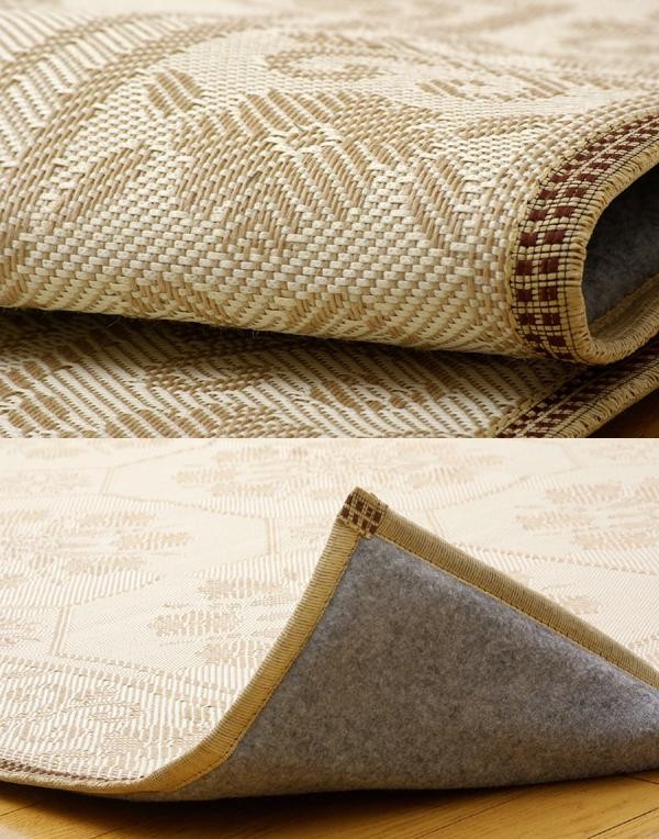 麻の一種であるジュート糸と、ポリエチレン糸のジャガード織のカーペットです。裏面にはフローリングを傷つけにくいよう不織布を貼っています。また、中材にはウレタンを使用しているのでクッション性があります。 |