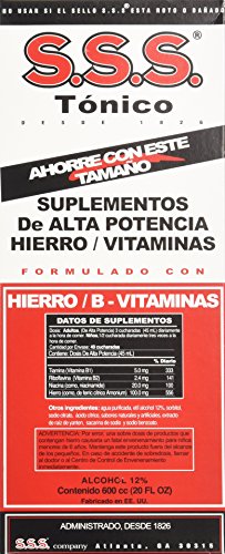 -. Binding : Health and Beauty -. Brand : S.S.S. CO. -. EAN : 0785923418889 -. Feature : S.S.S. B Complex Vitamin Tonic Liquid gives you iron and B complex vitamins for good health. / Gives you more than the minimum daily requirements of iron and certain important -. IsAdultProduct : 0 -. Label : S.S.S. CO -. LegalDisclaimer : Content on this site is for reference purposes and is not intended to substitute for advice given by a physician, pharmacist, or other licensed health-care professional. You should not use this information as self-diagnosis or for treating a health problem or disease. When you receive an item, carefully read all labels, warnings, and directions before use. Actual product packaging and materials may contain more and/or different information than shown on this website. Contact your health-care provider immediately if you suspect that you have a medical problem. Information and statements on this website regarding dietary supplements have not been evaluated by the Food and Drug Administration, and are not intended to diagnose, treat, cure, or prevent any disease or health condition. -. Manufacturer : S.S.S. CO -. Model : S.S.S.094003 -. MPN : 1825 -. PackageQuantity : 1 -. PartNumber : 1825 -. ProductGroup : Beauty -. ProductTypeName : HEALTH_PERSONAL_CARE -. Publisher : S.S.S. CO -. Studio : S.S.S. CO -. Title : S.S.S. B - Complex Vitamin Tonic Liquid - 20 Oz by S.S.S. CO -. UPC : 785923452913