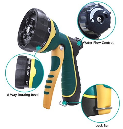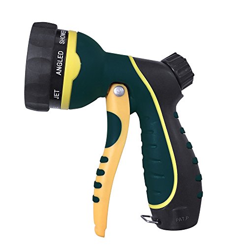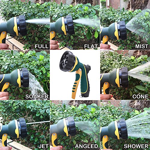 - MULTI-PURPOSE: This water nozzle has 8 patterns. They are spray, full, soak, spray, flat, cone and shower nozzle modes. It is versatile enough to meet all your gardening requirements. So it is not only great to mist the beautiful flowers, spray the dry driveways, bath the pets, wash the cars but also good to create strong jet flow for floor cleaning, and so on. Additionally, it was designed to perfectly fit all standard garden hoses on the market.