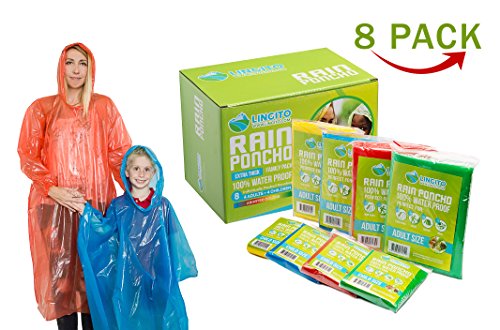 -. Feature : 8 Extra thick quality family pack rain ponchos, Individually packed , 4 Adult and 4 Child Size / Lightweight Ponchos, makes it easy to travel with. store in a pocket, bag pack, purse, car and office / 100% water proof material, Adult size is extra long with full sleeve and hood, 0.03mm thick, / These Emergency Ponchos, Emergency Rain Gear , Weather protection are Great for theme parks , Disney Land, Hiking, Camping, Site Seeing, Dog walkers / String Hood, Full Sleeve , Extra Thick- Can be used as disposable poncho as well