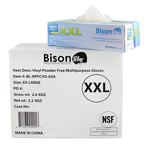 Studio : Bison Production Company Publisher : Bison Production Company Binding : Office Product Product Description The Bison Life NSF Powder free Multi purpose Disposable Vinyl Gloves are a customized solution to reduce risks of food contamination and provide extra-protection to your hands while performing different errands. Bare hand contact with food or any products in due course lead to contamination. This is when the utilization of gloves prove to be useful. Besides protecting your hand from oils, corrosives, chemicals and more, gloves guarantee safety and hygiene of all the products or equipment you handle. Bison Life NSF certified powder free Vinyl glove is crafted with a cutting-edge design, has advanced comfort and grip and is tailored for multipurpose use. These gloves can be used in maintenance, safety and food industry. These gloves can additionally be used in other fields to shield your hands while you are engaged in various activities including handling of tools and machinery. - Multi-purpose glove with comfortable fit for easy usage and ample protection - Enhanced and exceptional tactile sensitivity - NSF Certified - highest certification standard in the industry - Free of DOP/DEHP (di-octyl-phthalate / di-2-ethyl hexyl phthalate), this multi-purpose glove is absolutely safe and reliable - Comes in a flat-packed design, thereby making provision for optimum dispensing - Improvised grip for comfortable handling of items - Available in all sizes from S to XXL - 100% Latex powder free. The Bison LifeTM Promise Bison LifeTM is dedicated to providing healthful, gentle and safe personal care products for the entire family. We continuously strive to be your trusted partner in wellness and exceed your expectations. We would like to hear from you with any comments or suggestions 0