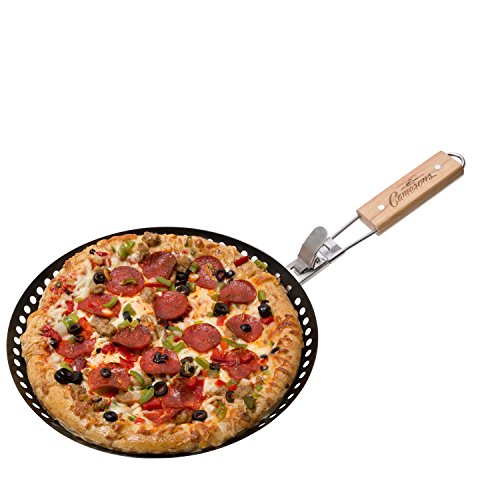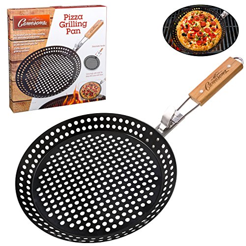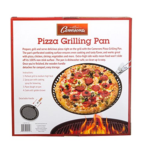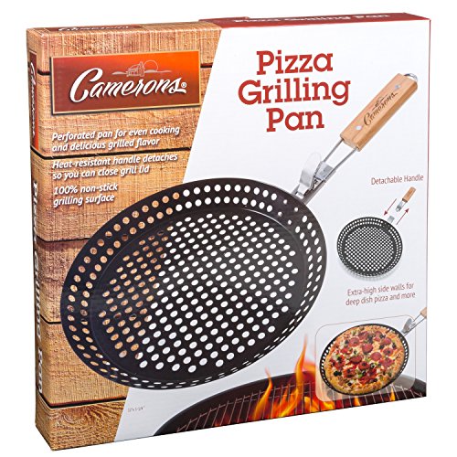 Studio : Camerons Products Publisher : Camerons Products Product Description Pizza Grill Pan- 100% Non-Stick Homemade Pizza Pan, Extra High Side Walls and Removable Handle for Easy Grilling- Prepare, grill and serve delicious homemade pizza with the Camerons Pizza Grilling Pan. The pan's perforated cooking surface ensures even cooking and tasty flavor, and works great with pizza, chicken, shrimp, vegetables and more. Extra-high side walls mean food won't slide off its 100% non-stick grilling surface, and you can even cook deep dish pizza, too. The pan is dishwasher safe, so clean up is easy. Once you're finished, the wooden handle folds in for compact, easy storage. 0
