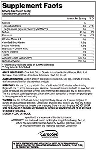 - Includes Active Ingredients: HydroMax, Carnosyn Beta-alanine, Betaine, L-Citrulline malate 2:1, Choline Bitartrate